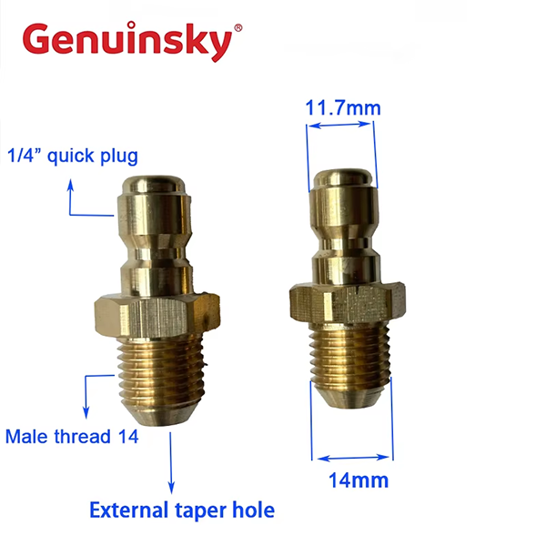 Đây là các phụ kiện phích cắm nhanh bằng đồng bằng đồng 1/4 inch. Bản thân sản phẩm có lỗ côn bên ngoài 1/4 ", và đầu này là nam AD 14, đường kính là 14mm. Đầu còn lại là phích cắm nhanh 1/4" với đường kính 11,7mm.