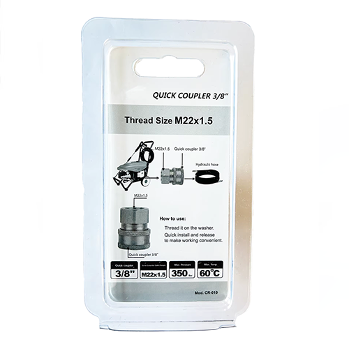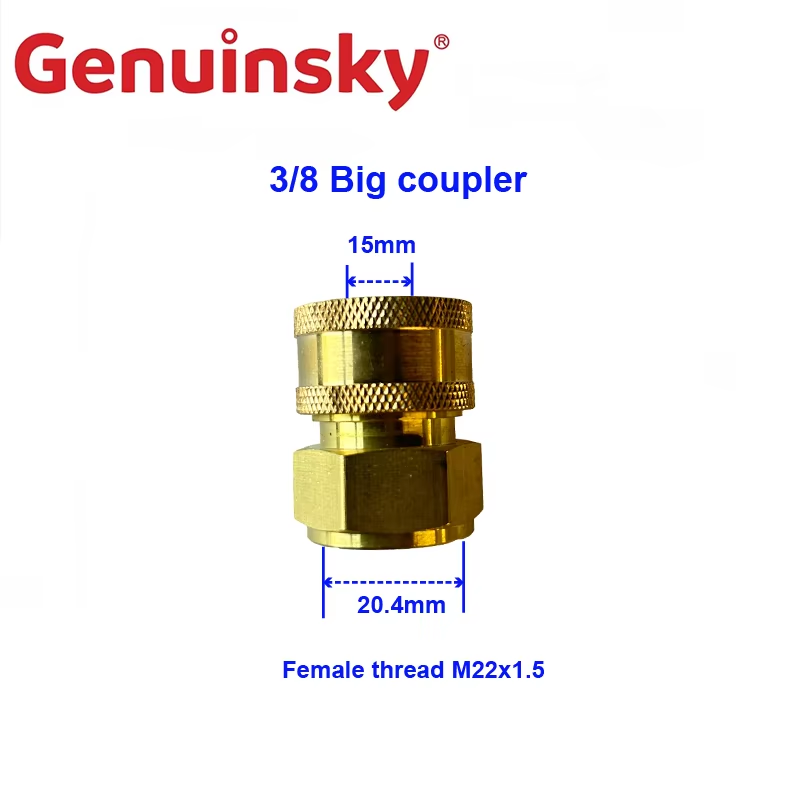 Khớp nối lớn 3/8, cơ thể được làm bằng tất cả đồng, và vật liệu bằng đồng có những lợi thế lớn trong khả năng chống ăn mòn. Một đầu của sản phẩm là sợi nữ M22 × 1,5, với đường kính bên trong 20,4mm, được trang bị máy giặt niêm phong, có thể được sử dụng với ống bện dây thép và ống áp suất cao của các thông số kỹ thuật tương ứng.