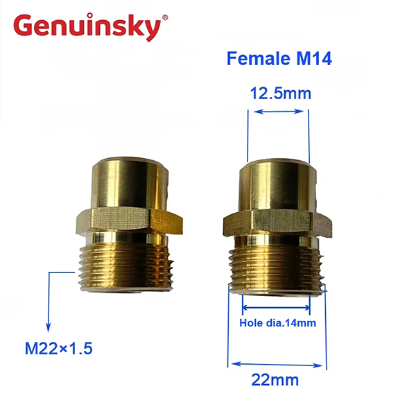 Ống đồng thau phù hợp phù hợp cho thiết bị rửa xe áp suất cao. Trước hết, hãy bắt đầu với kích thước của chính sản phẩm. Một đầu là sợi nam M22 × 1.5, với đường kính 22mm và lỗ dia.14mm. Ở đầu kia là sợi nữ M14, với đường kính 12,5mm. Nó có thể được sử dụng với máy làm sạch áp suất cao phù hợp theo nhu cầu.