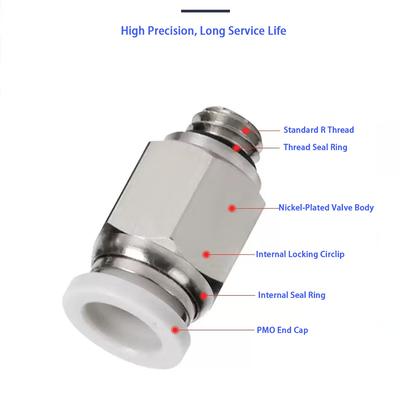 Vì vậy, dù ở trong môi trường ẩm ướt, bụi bặm lâu ngày vẫn có thể hoạt động ổn định, không dễ bị rỉ sét sẽ ảnh hưởng đến độ ổn định của kết nối. Bên trong sử dụng một vòng đệm lõm đặc biệt, có diện tích tiếp xúc lớn hơn nên độ vừa vặn cao hơn và độ kín chắc chắn hơn. Đồng thời, bản thân sản phẩm được thiết kế với ren R tiêu chuẩn của ren công nghiệp thông thường. Đồng thời, sự kết hợp giữa ren R tiêu chuẩn và lò xo khóa bên trong sẽ tránh được sự mài mòn và rò rỉ do lỏng các bộ phận, điều này có thể tăng thêm khả năng bảo vệ kép cho công việc bịt kín, điều đó cũng có nghĩa là tuổi thọ của sản phẩm được kéo dài hơn rất nhiều. Cuối cùng, ren của Dòng đầu nối Micro Mini được phủ trước bằng keo PTFE. Tetrafluoroethylene, một loại vật liệu được mệnh danh là "vua nhựa", bản thân nó có độ ổn định hóa học rất tốt và độ bôi trơn nhất định, nghĩa là nó không chỉ có thể tối ưu hóa hiệu quả bịt kín của sợi. Do đó, nó còn có thể giảm độ mòn của sợi ở một mức độ nhất định, đồng thời kéo dài tuổi thọ của sản phẩm hơn nữa. Sản phẩm này có hiệu suất bịt kín tuyệt vời, do đó nó có thể duy trì hiệu quả bịt kín "chống nhỏ giọt" khi làm việc tần số cao trong điều kiện làm việc áp suất cao của hệ thống khí nén. Phạm vi dung sai của chính Dòng đầu nối Micro Mini nằm trong phạm vi nhiệt độ 0-60°C. Ngoài ra, áp suất đảm bảo tối đa có thể đạt tới 1,32MPa và phạm vi áp suất làm việc bình thường là 0-0,9MPa, có thể đáp ứng đầy đủ hoạt động ổn định của các thiết bị yêu cầu điều kiện làm việc áp suất cao như dụng cụ khí nén và xi lanh tự động. Đồng thời, để đáp ứng nhu cầu bố trí đường ống trong điều kiện làm việc phức tạp, khớp nối với van tiết lưu hỗ trợ điều chỉnh xoay 360°, nghĩa là nó có thể phá vỡ giới hạn của việc cố định góc khớp truyền thống và hướng của khí quản có thể được điều chỉnh tự do theo không gian lắp đặt của thiết bị. Cuối cùng, sự kết nối của sản phẩm cũng theo kiểu kép. Nó có thể được kết nối bằng cách siết ren hoặc cũng có thể là kết nối cắm trực tiếp. Loại cắm trực tiếp có thể hỗ trợ khóa khí quản và có thể rút ống ra bằng cách ấn vào nắp cuối. Phương pháp kết nối đơn giản này cải thiện đáng kể hiệu quả công việc và tiết kiệm thời gian lắp đặt và tháo gỡ.Genuinsky cung cấp các sản phẩm chất lượng cao với độ chính xác cao, tuổi thọ cao và khả năng bịt kín chắc chắn để truyền chất lỏng chính xác.