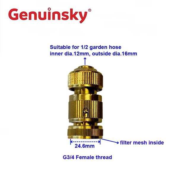 Đầu nối máy giặt áp lực là một phần kết nối của đầu vào nước của máy giặt áp suất cao được sử dụng rất nhiều trong cuộc sống hàng ngày. Nó phù hợp với 1/2 vòi vườn, bên trong dia.12mm, bên ngoài dia.1 6 mm, đầu kia là chỉ nữ G3/4, với đường kính 24,6mm, và có lưới lọc bên trong.