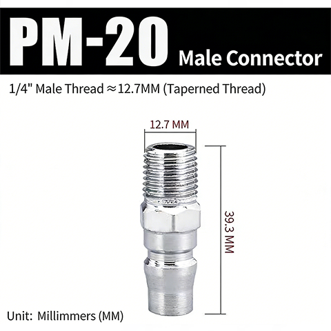 1. PM-20. Ren ngoài 1/4 inch là cấu trúc ren ngoài hình nón. Đường kính của phần ren là 12,7 mm và tổng chiều dài của sản phẩm là 39,3 mm.