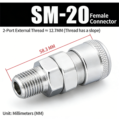 1. SM-20. Đầu nối đực 1/2 inch, đường kính ren là 20,5 mm và chiều dài tổng thể là 43,7 mm.