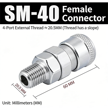Khớp nối nhanh loại C dòng PM–SM với ren JIS PT có cấu trúc phích cắm nhanh loại C. Đầu nam và đầu nữ có thể ghép theo ý muốn, có thể cắm điện và kết nối, rất tiện lợi. Khớp được xử lý mạ điện bề mặt, với lõi đồng bên trong, không chỉ chống ăn mòn mà còn chống mài mòn, giúp cải thiện độ bền của khớp và kéo dài tuổi thọ sử dụng.